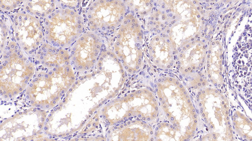 DAB staining on IHC-P; Sample: Porcine Kidney Tissue; Primary Ab: 40ug/ml Mouse Anti-Porcine APOA1 Antibody Second Ab: 2ug/mL HRP-Linked Caprine Anti-Mouse IgG Polyclonal Antibody