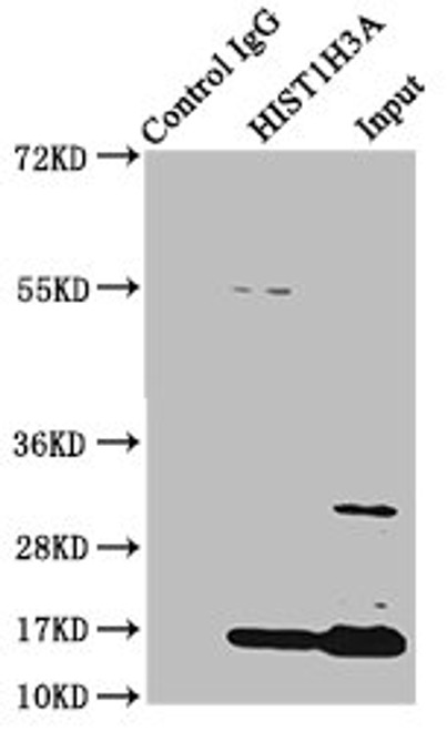 Immunoprecipitating HIST1H3A in Hela whole cell lysate, Lane 1: Rabbit control IgG instead of CAC15395 in Hela whole cell lysate. For western blotting, a HRP-conjugated Protein G antibody was used as the secondary antibody (1/2000), Lane 2: CAC15395 (5ug) + Hela whole cell lysate (500ug), Lane 3: Hela whole cell lysate (20ug)