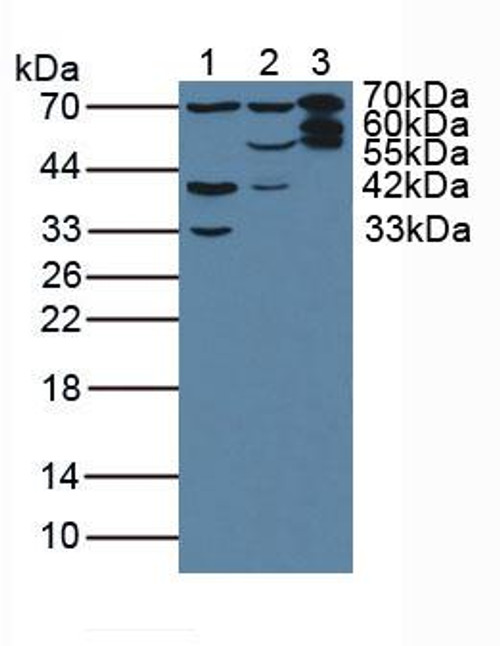 Western Blot; Sample: Lane1: Porcine Liver Tissue; Lane2: Porcine Heart Tissue; Lane3: Mouse Liver Tissue.
