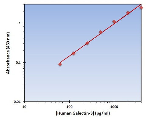 Galectin-3 (Human) Sandwich ELISA Kit for detecting Galectin-3 in plasma, serum, lysate. Species Reactivity: Human (Homo sapiens). Detection Range: 63-4000pg/ml. Sensitivity:. Format: 96-Well Plate. Assay Type: Sandwich. Detection Method: Colorimetric. Assay Time: 4h, 30min. Accession Number: P17931. Gene ID: 3958. Target Synonyms: Gal-3; 35 kDa lectin; Carbohydrate-binding protein 35; CBP 35; Galactose-specific lectin 3; Galactoside-binding protein; GALBP; IgE-binding protein; Laminin-binding protein; Lectin L-29; Mac-2 antigen. Restrictions: For Research Use Only. Not for use in diagnostic procedures.