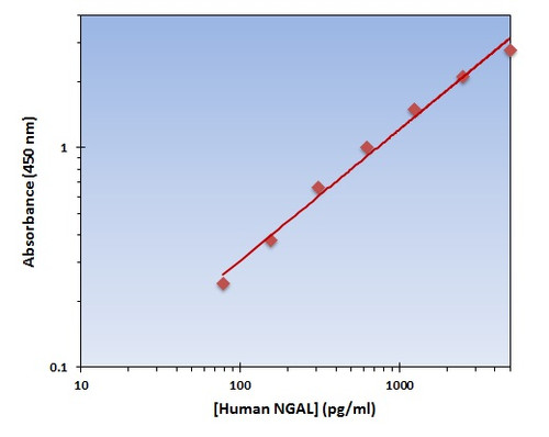 NGAL (Human) Sandwich ELISA Kit for detecting NGAL in plasma, serum, lysate. Species Reactivity: Human (Homo sapiens). Detection Range: 79-5000pg/ml. Sensitivity:. Format: 96-Well Plate. Assay Type: Sandwich. Detection Method: Colorimetric. Assay Time: 4h, 30min. Accession Number: P80188. Gene ID: 3934. Target Synonyms: Neutrophil gelatinase-associated lipocalin; 25 kDa alpha-2-microglobulin-related subunit of MMP-9; Lipocalin-2; Oncogene 24p3; p25. Restrictions: For Research Use Only. Not for use in diagnostic procedures.
