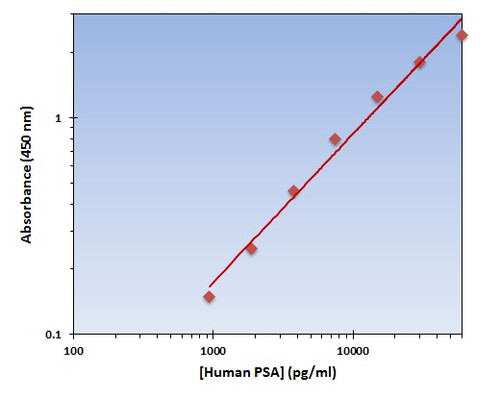 PSA (Human) Sandwich ELISA Kit for detecting PSA in plasma, serum, lysate. Species Reactivity: Human (Homo sapiens). Detection Range: 938-60000pg/ml. Sensitivity:. Format: 96-Well Plate. Assay Type: Sandwich. Detection Method: Colorimetric. Assay Time: 4h, 30min. Accession Number: P07288. Gene ID: 354. Target Synonyms: Prostate-specific antigen; PSA; Gamma-seminoprotein; Seminin; P-30 antigen; Semenogelase. Restrictions: For Research Use Only. Not for use in diagnostic procedures.