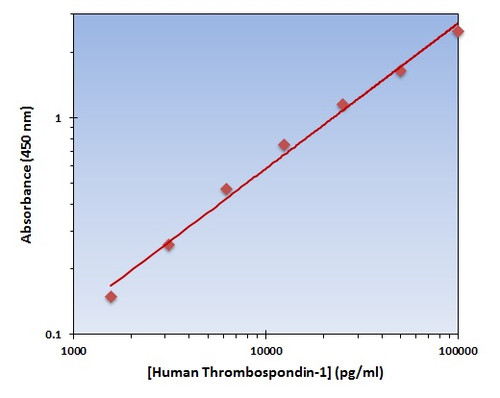 Thrombospondin-1 (Human) Sandwich ELISA Kit for detecting Thrombospondin-1 in plasma, serum, lysate. Species Reactivity: Human (Homo sapiens). Detection Range: 1563-100000pg/ml. Sensitivity:. Format: 96-Well Plate. Assay Type: Sandwich. Detection Method: Colorimetric. Assay Time: 4h, 30min. Accession Number: P07996. Gene ID: 7057. Target Synonyms: TSP; TSP1. Restrictions: For Research Use Only. Not for use in diagnostic procedures.