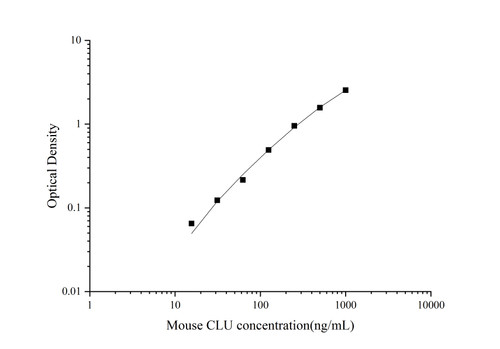 Mouse CLU (Clusterin) ELISA Kit for detecting CLU in Serum, Plasma, Other Biological Fluids. Species Reactivity: Mouse (Mus musculus). Detection Range: 15.63-1000ng/ml. Sensitivity: 9.38ng/ml. Format: 96-Well Plate. Assay Type: Sandwich. Detection Method: Colormetric. Assay Time: 3h, 30min. Accession Number: Q06890. Target Synonyms: TIMP1; CLGI; EPA; EPO; HCI;. Restrictions: For Research Use Only. Not for use in diagnostic procedures.
