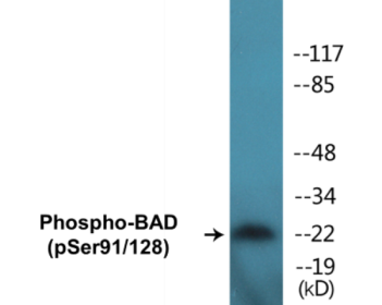 Phospho-BAD (Ser91/128) Colorimetric Cell-Based ELISA Kit for detecting Phospho-BAD (Ser91/128) in researchers plate their cell line of choice. Species Reactivity: Human (Homo sapiens), Mouse (Mus musculus), Rat (Rattus norvegicus). Detection Range: Qualitative. Sensitivity: At least 5000 cells/well. Format: 96-Well Plate. Assay Type: Cell-Based. Detection Method: Colorimetric. Assay Time: 4h, 30min. Accession Number: Q92934. Gene ID: 572. Target Synonyms: BAD; BBC6; Bcl- XL/Bcl-2 associated death promoter; Bcl-2 binding component 6; Bcl-2-like 8 protein; Bcl-xL/Bcl-2 associated death promoter; Bcl2-antagonist of cell death; BCL2L8. Restrictions: For Research Use Only. Not for use in diagnostic procedures.