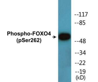 Phospho-FOXO4 (Ser262) Colorimetric Cell-Based ELISA Kit for detecting Phospho-FOXO4 (Ser262) in researchers plate their cell line of choice. Species Reactivity: Human (Homo sapiens), Mouse (Mus musculus). Detection Range: Qualitative. Sensitivity: At least 5000 cells/well. Format: 96-Well Plate. Assay Type: Cell-Based. Detection Method: Colorimetric. Assay Time: 4h, 30min. Accession Number: P98177. Gene ID: 4303. Target Synonyms: AFX; AFX1; Afxh; forkhead box protein O4; forkhead domain AFX1; MLLT7; myeloid/lymphoid or mixed-lineage leukemia (trithorax homolog; Drosophila) translocated to; 7 (AFX1). Restrictions: For Research Use Only. Not for use in diagnostic procedures.
