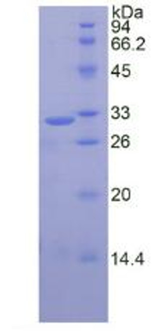 Recombinant Human Calpain 1 (CAPN1) is a purified Prokaryotic Protein. Purity: >95% by SDS-PAGE. Host: E. coli. Endotoxin Level: <1.0EU per 1ug, by the LAL method. Species: Human (Homo sapiens). Target Name: Calpain 1 (CAPN1). Target Synonyms: PIG30; CANPL1; MuCANP; MuCL; Calpain 1, Large Subunit; Calpain-1 Catalytic Subunit; Calcium-Dependent Protease 1; Calcium-activated neutral proteinase 1; Calpain mu-type; Micromolar-calpain. Accession Number: P07384. Gene ID: 823. Expression Region: Pro75~Arg343. Tag Info: N-terminal His Tag. Theoretical MW: 32kDa. Buffer: PBS, pH7.4, containing 0.01% SKL, 5% Trehalose. Storage: -20°C. Avoid repeated freeze/thaw cycles. Restrictions: For Research Use Only. Not for use in diagnostic procedures.