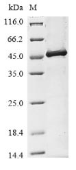 Recombinant Human Transmembrane protease serine 2 (TMPRSS2), partial is a purified Recombinant Protein; Coronavirus Protein. Purity: >90% as determined by SDS-PAGE. Host: E. coli. Endotoxin Level: Not Tested. Species: Human (Homo sapiens). Target Name: TMPRSS2. Target Synonyms: D16Ertd61e; Epitheliasin; FLJ41954; MGC6821; PP9284; PRSS10; Serine protease 10; TMPRSS2; TMPRSS2 ERG FUSION GENE, INCLUDED; TMPRSS2 ETV1 FUSION GENE, INCLUDED; TMPS2_HUMAN. Accession Number: O15393. Expression Region: 106~492aa. Tag Info: N-Terminal 6Xhis-Tagged. Theoretical MW: 46.9kDa. Buffer: If the delivery form is liquid, the default storage buffer is Tris/PBS-based buffer, 5%-50% glycerol. If the delivery form is lyophilized powder, the buffer before lyophilization is Tris/PBS-based buffer, 6% Trehalose, pH 8.0. Storage: -20°C. Avoid repeated freeze/thaw cycles. Restrictions: For Research Use Only. Not for use in diagnostic procedures.