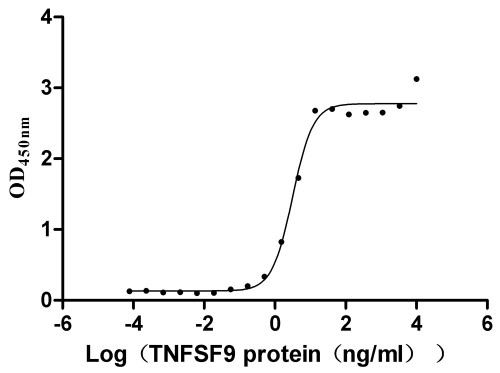 Recombinant Human Tumor necrosis factor ligand superfamily member 9 (TNFSF9), partial, Active Protein is a purified Active Recombinant Protein. Purity: >90% as determined by SDS-PAGE. Host: Mammalian Cell. Endotoxin Level: <1.0 EU/ug as determined by LAL method. Species: Human (Homo sapiens). Target Name: TNFSF9. Target Synonyms: 4-1BB ligand; 4-1BBL. Accession Number: P41273. Expression Region: 71~254aa. Tag Info: N-Terminal Hfc-Myc-Tagged. Theoretical MW: 48.0kDa Storage: -20°C. Avoid repeated freeze/thaw cycles. Restrictions: For Research Use Only. Not for use in diagnostic procedures.
