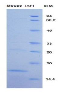 Recombinant Mouse Carboxypeptidase B2 (CPB2) is a purified Prokaryotic Protein. Purity: >90% by SDS-PAGE. Host: E. coli. Endotoxin Level: <1.0EU per 1ug, by the LAL method. Species: Mouse (Mus musculus). Target Name: Carboxypeptidase B2 (CPB2). Target Synonyms: TAFI; CPU; PCPB; Thrombin Activatable Fibrinolysis Inhibitor; Plasma Carboxypeptidase B; Carboxypeptidase U. Accession Number: Q9JHH6. Gene ID: 56373. Expression Region: His309~Asp374. Tag Info: N-terminal His Tag. Theoretical MW: 17kDa. Buffer: PBS, pH7.4, containing 0.01% SKL, 5% Trehalose. Storage: -20°C. Avoid repeated freeze/thaw cycles. Restrictions: For Research Use Only. Not for use in diagnostic procedures.