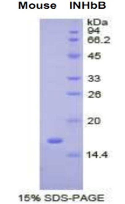 Recombinant Mouse Inhibin Beta B (INHbB) is a purified Prokaryotic Protein. Purity: >97% by SDS-PAGE. Host: E. coli. Endotoxin Level: <1.0EU per 1ug, by the LAL method. Species: Mouse (Mus musculus). Target Name: Inhibin Beta B (INHbB). Target Synonyms: INH-BB; Activin AB Beta Polypeptide. Accession Number: Q04999. Gene ID: 16324. Expression Region: Gly297~Ala411. Tag Info: N-terminal His Tag. Theoretical MW: 16kDa. Buffer: PBS, pH7.4, containing 0.01% SKL, 5% Trehalose. Storage: -20°C. Avoid repeated freeze/thaw cycles. Restrictions: For Research Use Only. Not for use in diagnostic procedures.