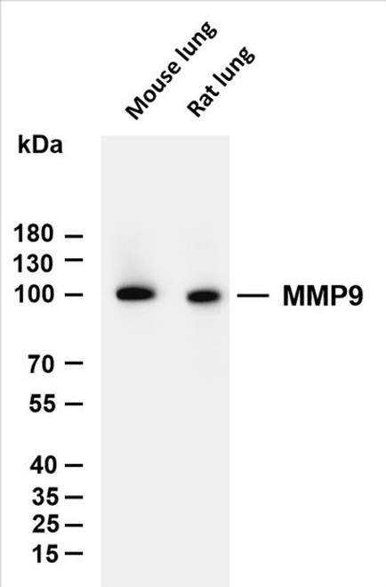 The MMP9 Recombinant Monoclonal Antibody (Species: Rabbit) has been validated for the following applications: WB, IHC, IF, IP, ELISA. Host: Rabbit. Species: Rabbit. Applications: WB, IHC, IF, IP, ELISA. Accession Number: P14780. Gene ID: 4318. Target Synonyms: Matrix metalloproteinase-9 (MMP-9; EC 3.4.24.35; 92 kDa gelatinase; 92 kDa type IV collagenase; Gelatinase B; GELB) [Cleaved into: 67 kDa matrix metalloproteinase-9; 82 kDa matrix metalloproteinase-9]. Restrictions: For Research Use Only. Not for use in diagnostic procedures.