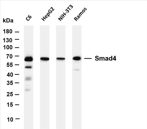 The Smad4 Recombinant Monoclonal Antibody (Species: Rabbit) has been validated for the following applications: WB, IHC, IF, IP, ELISA. Host: Rabbit. Species: Rabbit. Applications: WB, IHC, IF, IP, ELISA. Accession Number: Q13485. Gene ID: 5243. Target Synonyms: SMAD4; DPC4; MADH4; Mothers against decapentaplegic homolog 4; MAD homolog 4; Mothers against DPP homolog 4; Deletion target in pancreatic carcinoma 4; SMAD family member 4; SMAD 4; Smad4; hSMAD4. Restrictions: For Research Use Only. Not for use in diagnostic procedures.