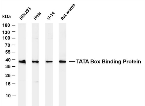 The TATA Box Binding Protein Recombinant Monoclonal Antibody (Species: Rabbit) has been validated for the following applications: WB, IHC, IF, IP, ELISA. Host: Rabbit. Species: Rabbit. Applications: WB, IHC, IF, IP, ELISA. Accession Number: P20226. Gene ID: 6908. Target Synonyms: TBP; GTF2D1; TF2D; TFIID; TATA-box-binding protein; TATA sequence-binding protein; TATA-binding factor; TATA-box factor; Transcription initiation factor TFIID TBP subunit. Restrictions: For Research Use Only. Not for use in diagnostic procedures.